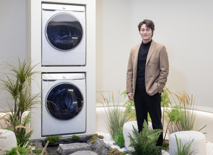▲ 임성빈 작가가 삼성 디지털프라자 강남본점에서 ‘삼성 그랑데 AI’ 세탁기·건조기로 구성한 작품 ‘빨래터’를 소개하고 있다.