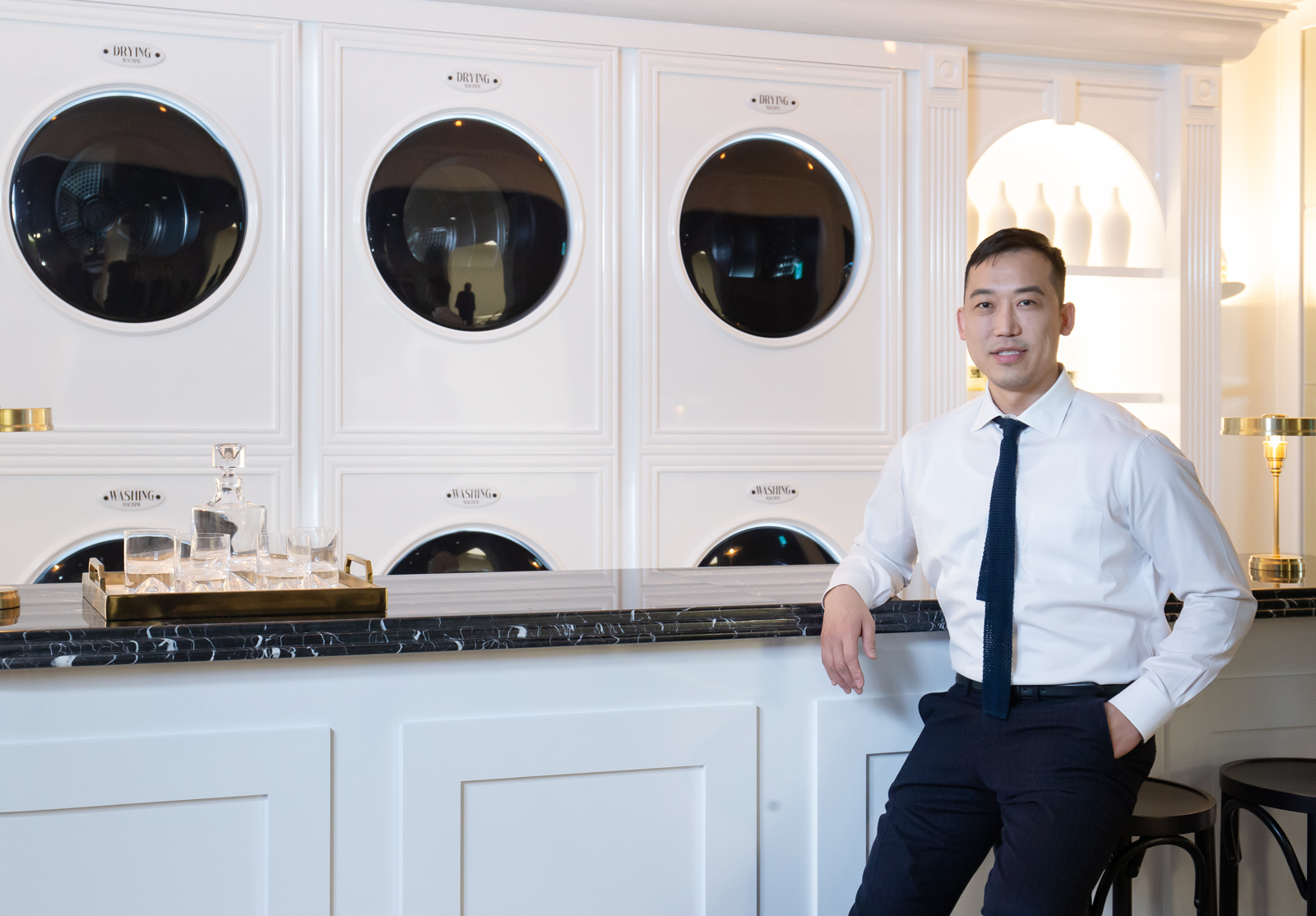 ▲ 장호석 작가가 삼성 디지털프라자 강남본점에서 ‘삼성 그랑데 AI’ 세탁기·건조기로 구성한 작품 ‘런드리바(Laundry Bar)’를 소개하고 있다.