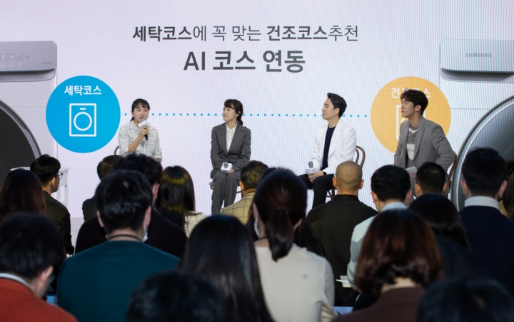 ▲ 삼성전자가 29일 삼성 디지털프라자 강남본점에서 기자간담회를 열고 ‘삼성 그랑데 AI’ 세탁기·건조기 신제품을 공개했다. 삼성전자 생활가전사업부 임직원과 이낙준 이비인후과 전문의(좌측에서 세번째), 배우 하석진씨가 제품을 소개하고 있다.