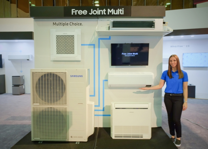 ▲ 삼성전자가 3일부터 5일까지 미국 올랜도에서 개최되는 북미 최대 규모 공조 전시회 AHR EXPO 2020에 참가한다. 삼성전자 모델이 최대 5대 실내기 연결이 가능한 다배관 형태의 가정용 멀티(Free Joint Multi) 실외기와 실내기를 소개하고 있다.