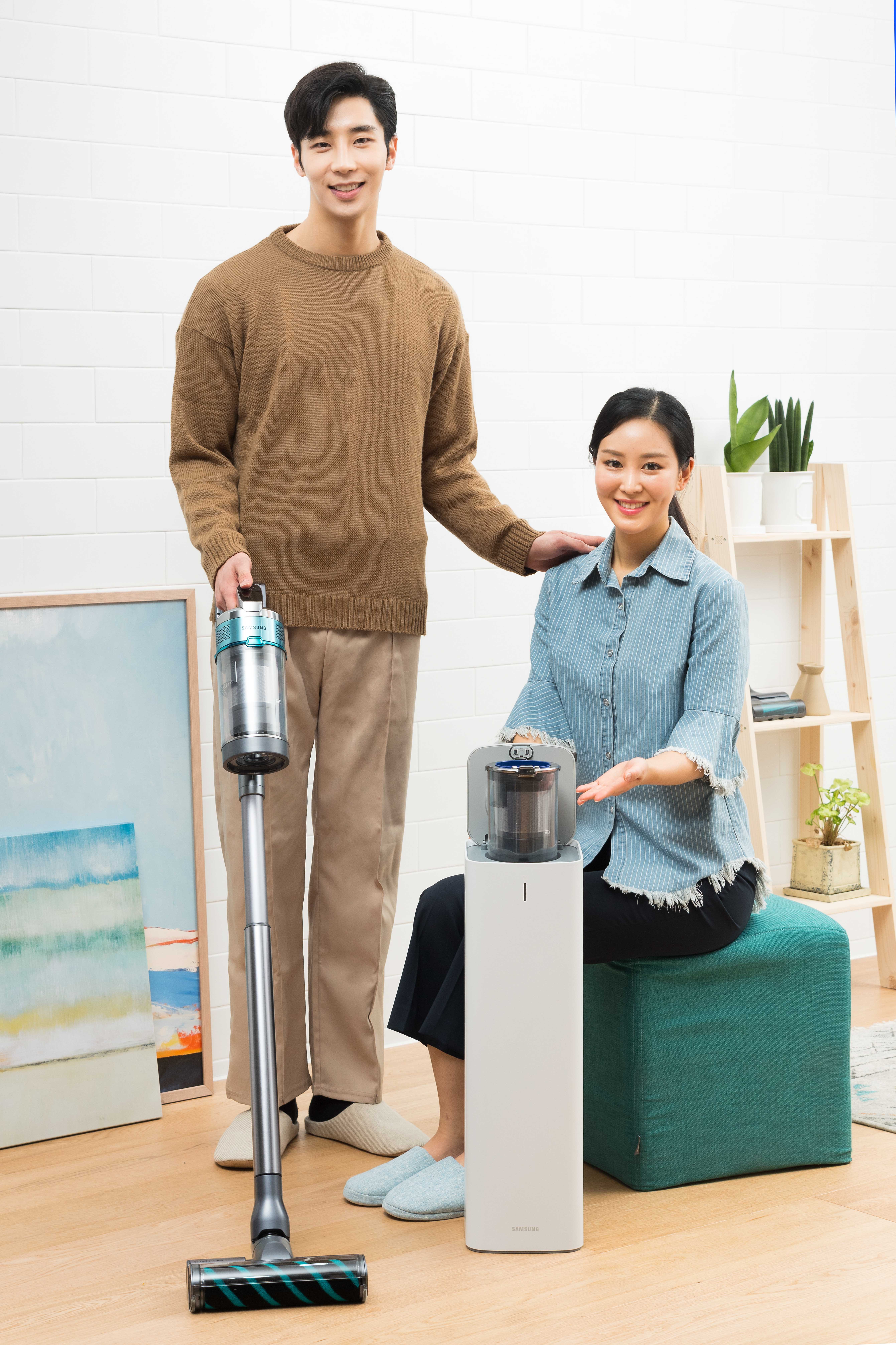 ▲ 삼성전자 모델이 수원시 매탄동에 위치한 삼성전자 디지털시티 프리미엄하우스에서 2020년형 프리미엄 무선 청소기 ‘삼성 제트’와 미세먼지 걱정 없이 먼지통을 간편하게 관리할 수 있는 ‘청정스테이션’ 신제품을 소개하고 있다.