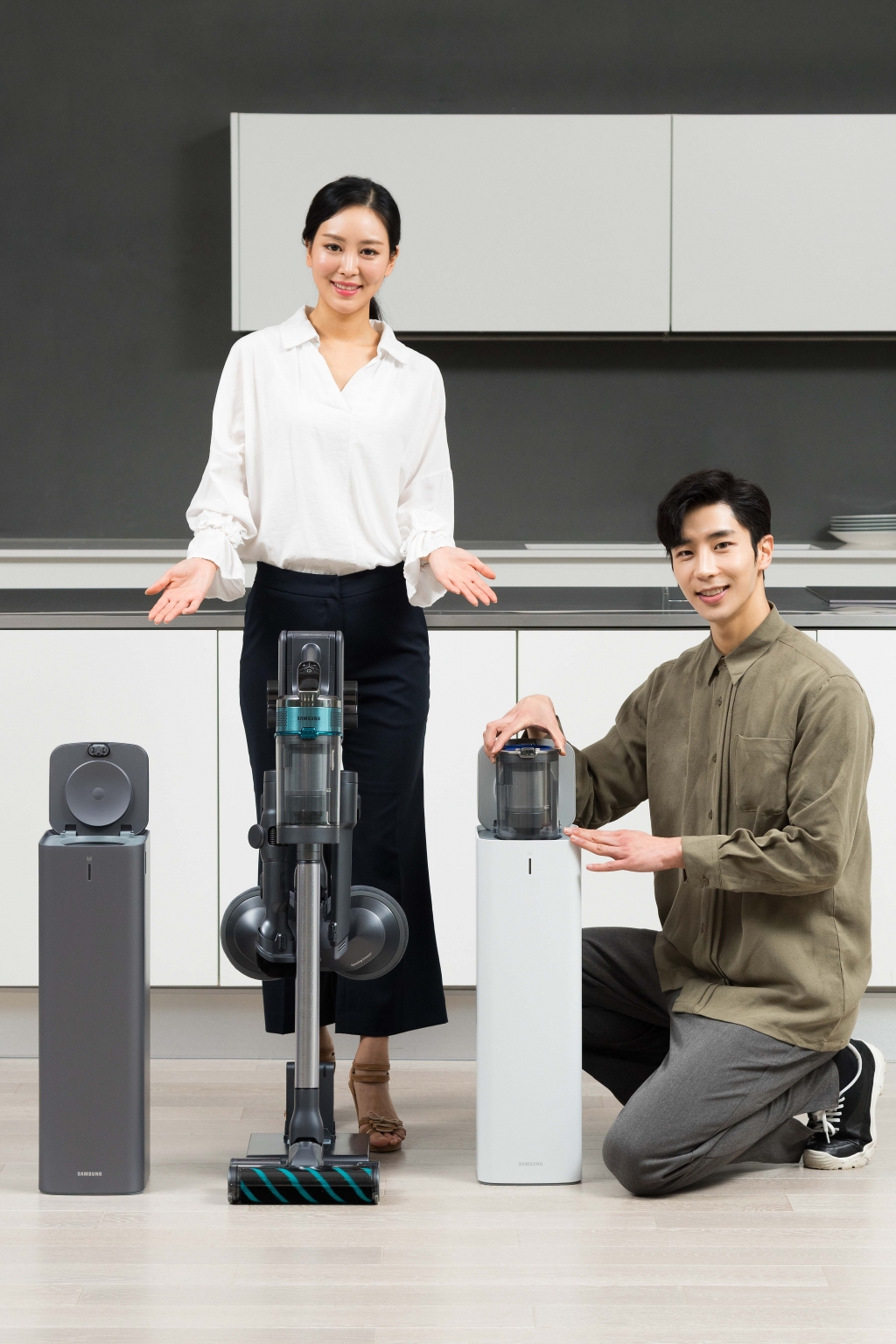▲ 삼성전자 모델이 수원시 매탄동에 위치한 삼성전자 디지털시티 프리미엄하우스에서 2020년형 프리미엄 무선 청소기 ‘삼성 제트’와 미세먼지 걱정 없이 먼지통을 간편하게 관리할 수 있는 ‘청정스테이션’ 신제품을 소개하고 있다.