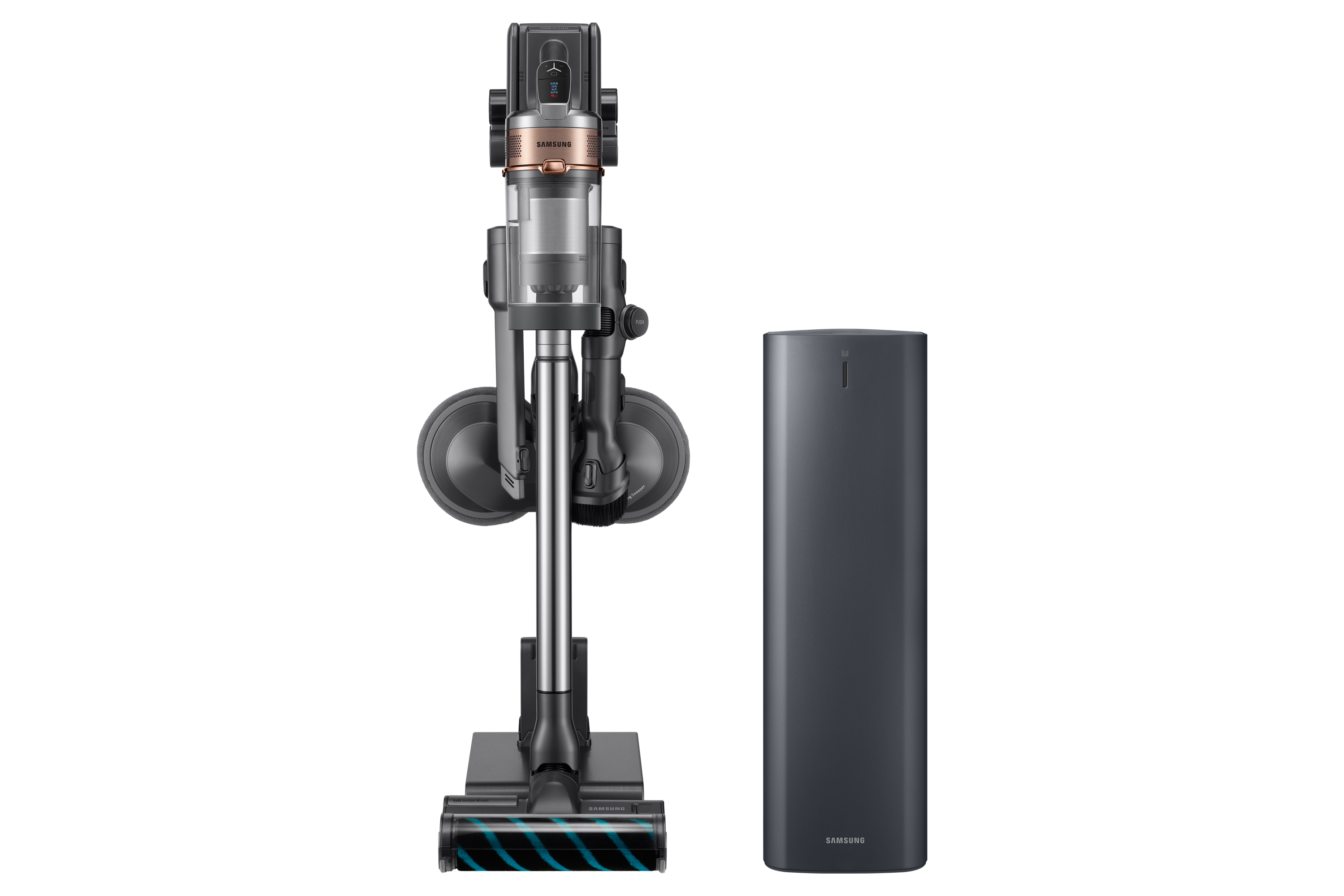 ▲ 2020년형 프리미엄 무선 청소기 ‘삼성 제트’(좌측, 모델명:VS20T9278S7), ‘청정스테이션’(우측, 모델명:VCA-SAE90A)