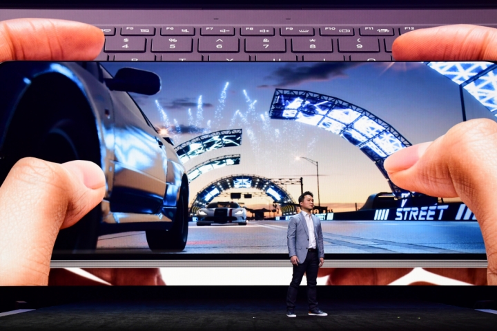 ▲ 삼성전자 미국법인의 모바일 채널 마케팅 리더인 데이비드 박(David S. Park)이 갤럭시 S20 시리즈의 강력한 게임 기능을 소개하고 있다. 그는 마이크로소프트와 협업해 모바일 기기에서 최초로 ‘포르자 스트리트(Forza Street)’ 게임을 이용할 수 있게 됐다고 발표해 환호를 자아냈다. 또 “5G 기반의 속도, 강력한 프로세서, 120Hz 디스플레이, 12GB 램(RAM)과 새로운 다이내믹 AMOLED 디스플레이를 갖춘 갤럭시 S20이 게임 경험을 한 차원 끌어올려 줄 것”이라고 강조했다.