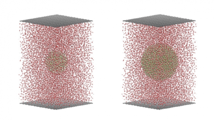 ▲ 액체 셀에 담긴 백금 나노 입자 모습. 2.5나노미터(사진 왼쪽)와 4.0나노미터(오른쪽)의 백금 나노 입자를 관찰한 모습으로 붉은 점은 산소, 회색은 수소, 검은색은 탄소, 노란색은 백금을 의미