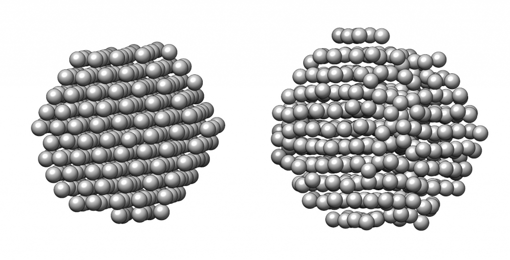 ▲ ‘3차원 증명 사진’으로 확인한 나노 입자의 구조적 차이. 원자가 잘 정렬된 왼쪽 나노 입자와 달리, 오른쪽 나노 입자는 내부에 결함이 있는 것을 확인 할 수 있음