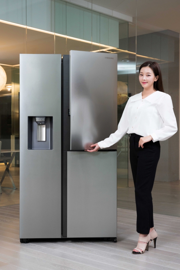 ▲ 삼성전자 모델이 수원 삼성전자 디지털시티 프리미엄하우스에서 정수기를 탑재한 ‘양문형 정수기 냉장고’ 신제품을 소개하고 있다.