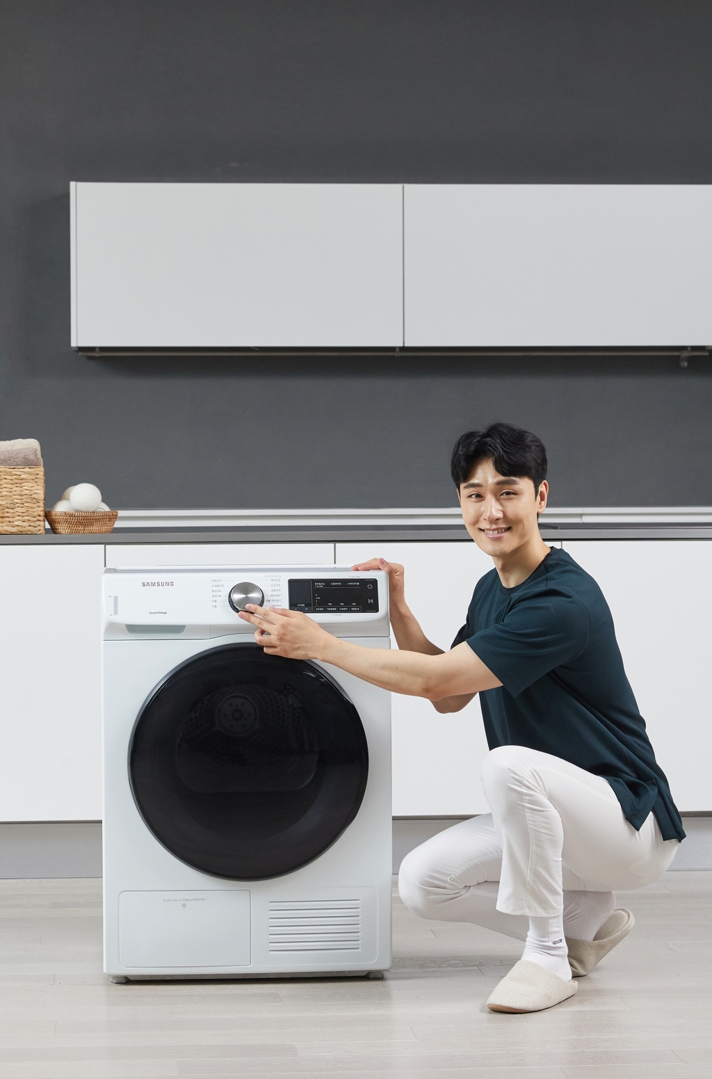 ▲ 삼성전자 모델이 수원 삼성전자 디지털시티 프리미엄하우스에서 에너지 소비효율 1등급인 9kg 건조기 신제품을 소개하고 있다.