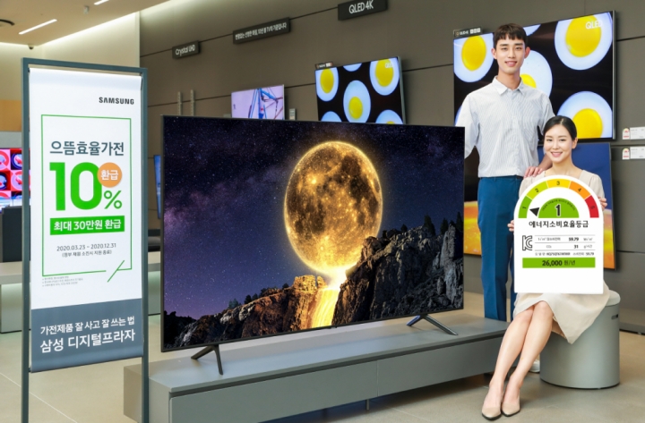 ▲ 삼성전자 모델이 삼성디지털프라자 강남본점에서 에너지 소비효율 1등급을 받은 QLED TV를 소개하고 있다.