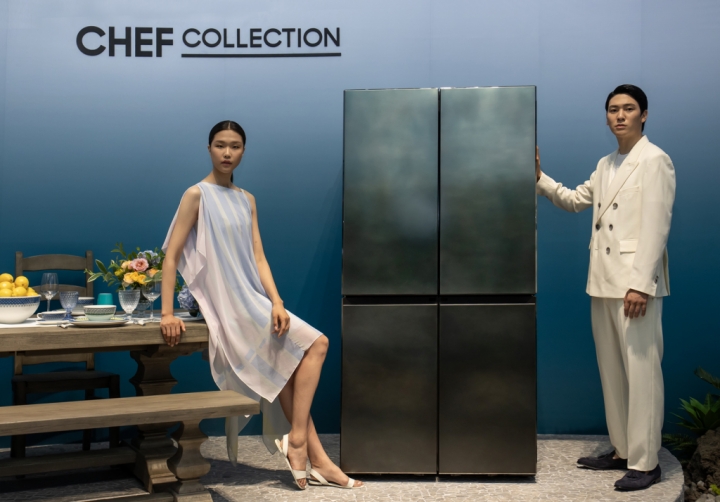 ▲ 삼성전자 모델이 서울 성수동에 마련된 체험존에서 ‘뉴 셰프컬렉션’ 냉장고를 소개하고 있다.
