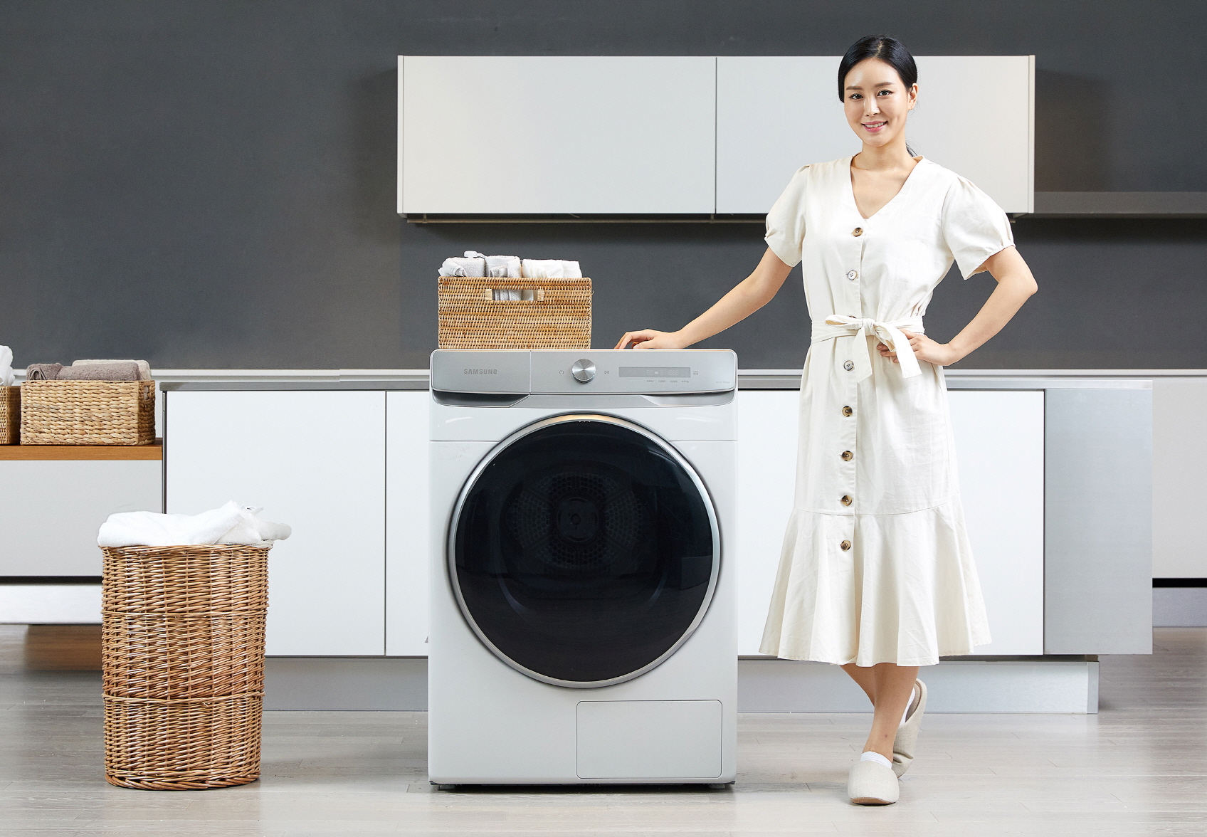▲ 삼성전자 모델이 수원 삼성전자 디지털시티 프리미엄하우스에서 국내 최대 용량인 17kg 그랑데 건조기 AI 신제품을 소개하고 있다.