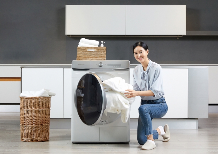 ▲ 삼성전자 모델이 수원 삼성전자 디지털시티 프리미엄하우스에서 국내 최대 용량인 17kg 그랑데 건조기 AI 신제품을 소개하고 있다.