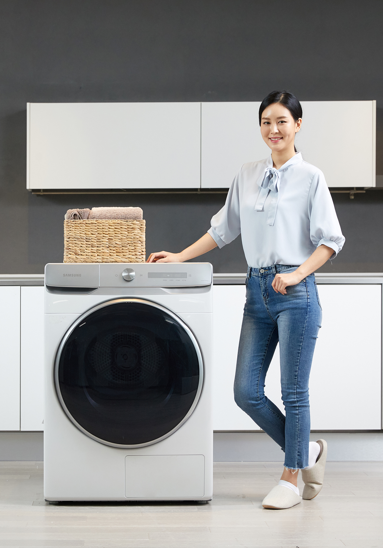 ▲ 삼성전자 모델이 수원 삼성전자 디지털시티 프리미엄하우스에서 국내 최대 용량인 17kg 그랑데 건조기 AI 신제품을 소개하고 있다.