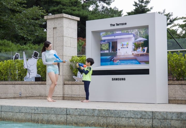 삼성전자가 아웃도어용 라이프스타일 TV ‘더 테라스(The Terrace)’를 국내에서는 처음으로 서울신라호텔 야외 수영장 ‘어번 아일랜드’ 키즈풀에 설치했다.