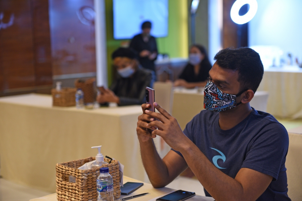 ▲ 지난 8월 18일 인도네시아 자카르타에서 열린 ‘갤럭시 노트20’ 출시 행사에 참석한 현지 기자들이 제품을 체험하고 있는 모습