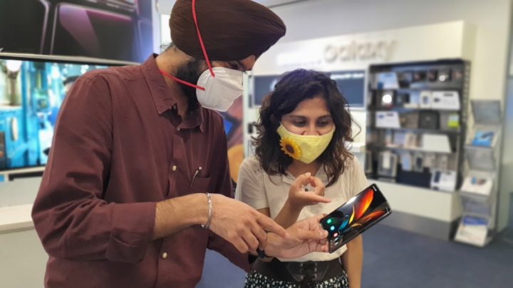 ▲ 인도 구루그람에 위치한 삼성B2B체험관에서 현지 소비자들이 ‘갤럭시 Z 폴드2’를 체험하고 있는 모습