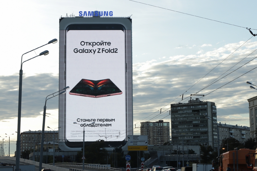 ▲ 러시아 모스크바 하이드로프로젝트(Hydroproject)에 설치된 ‘갤럭시 Z 폴드2’ 옥외광고
