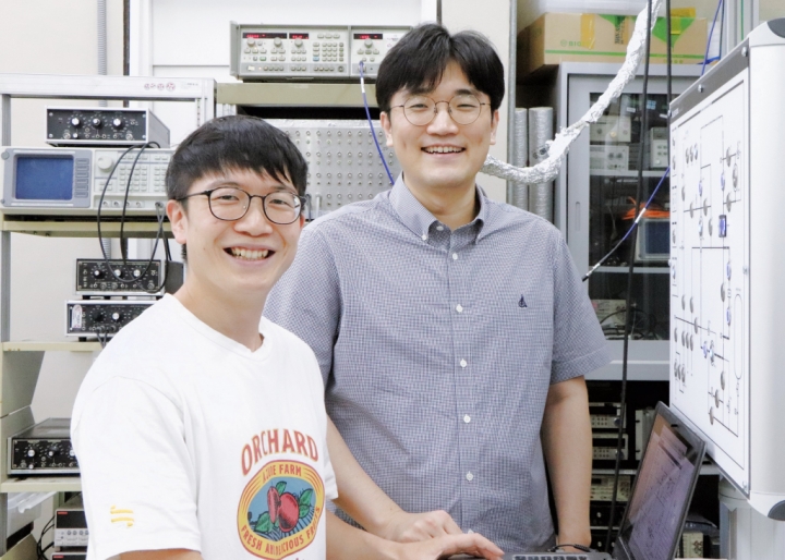 ▲ 마이크로파 세기를 기존 대비 약 10억 배 향상된 민감도로 검출할 수 있는 초고감도 검출기를 개발한 포스텍 물리학과 이길호 교수 연구팀. 정우찬 석박사 통합 과정 학생, 이길호 교수(사진 왼쪽부터)