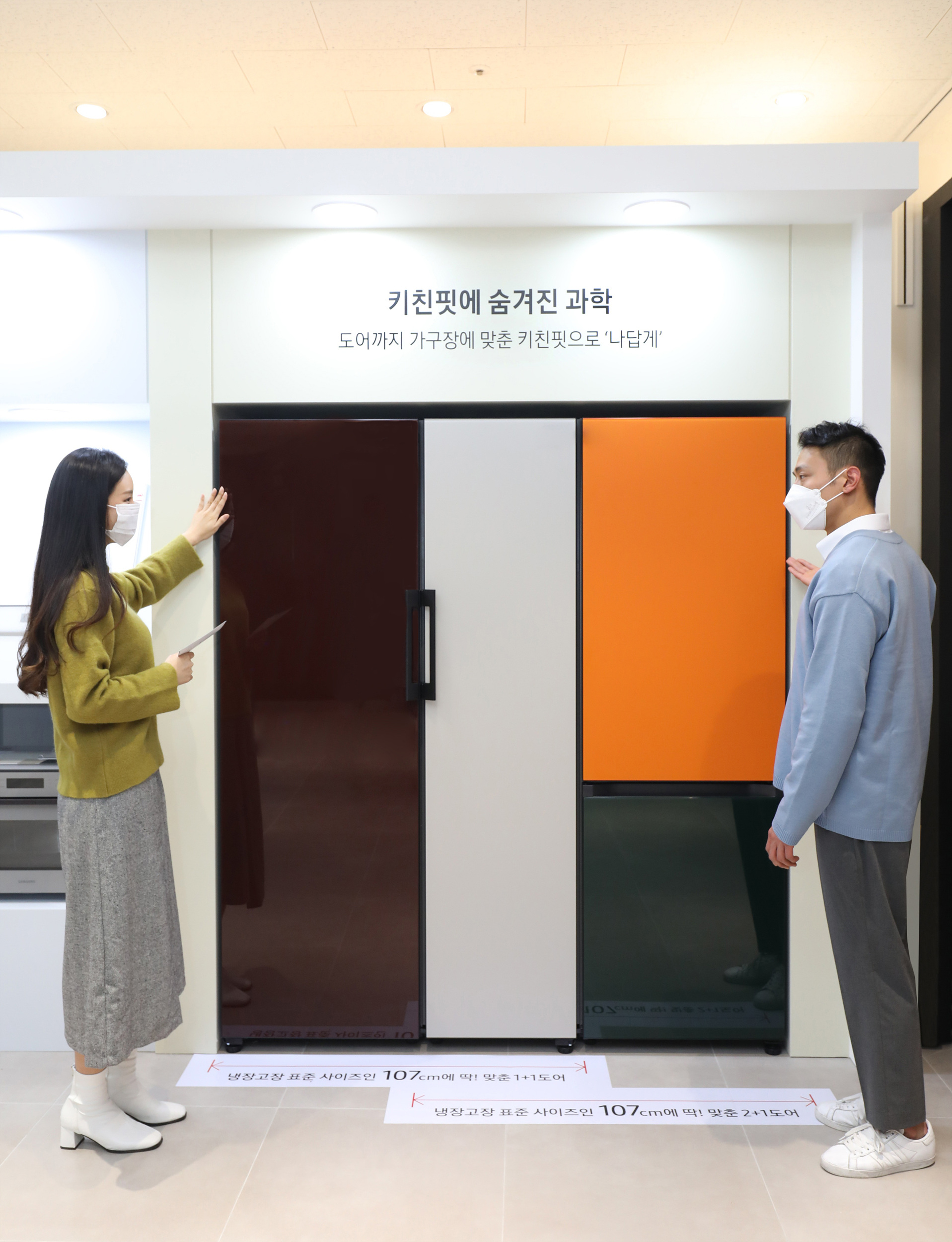 ▲ 삼성전자 모델이 ‘나답게 스튜디오’ 비스포크 키친존에서 가구장 크기에 맞춰 빌트인 효과를 낼 수 있는 키친핏이 적용된 맞춤형 가전 ‘비스포크’ 냉장고를 직접 체험하고 있다.