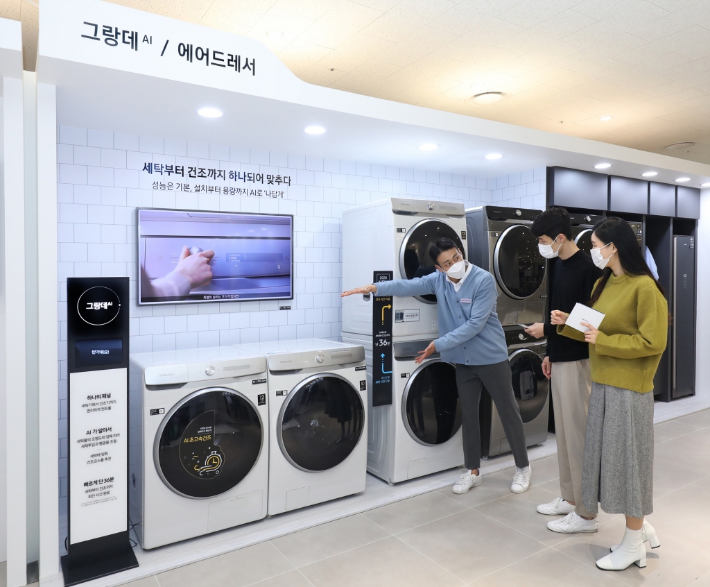 ▲ 삼성전자 모델이 ‘나답게 스튜디오’ 의류케어존에서 위·아래로, 옆으로도 자유롭게 설치할 수 있는 ‘그랑데 AI’를 살펴보고 있다.