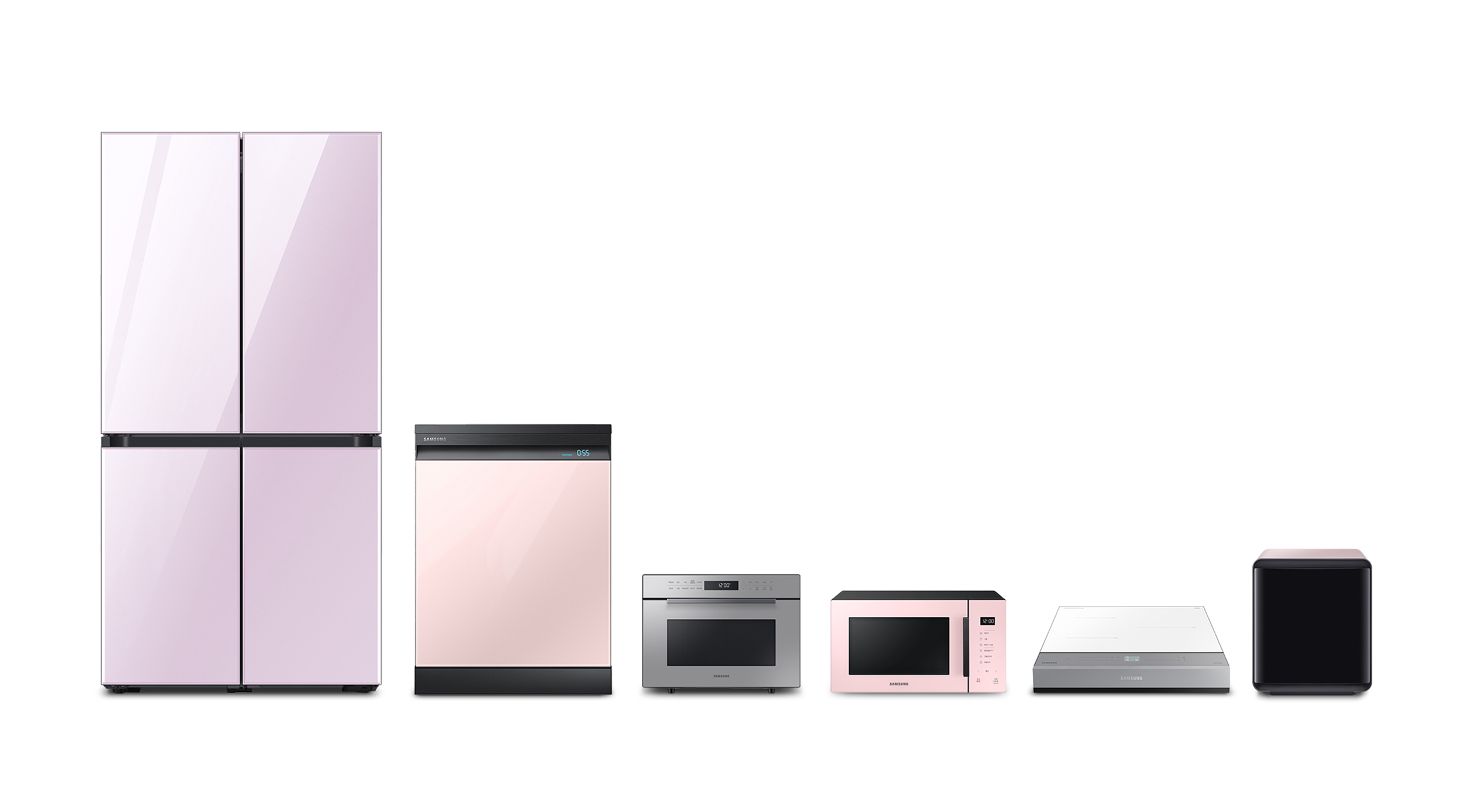 ▲ 삼성전자 비스포크 가전제품(왼쪽부터 냉장고, 식기세척기, 직화오븐, 전자레인지, 인덕션, 큐브냉장고)