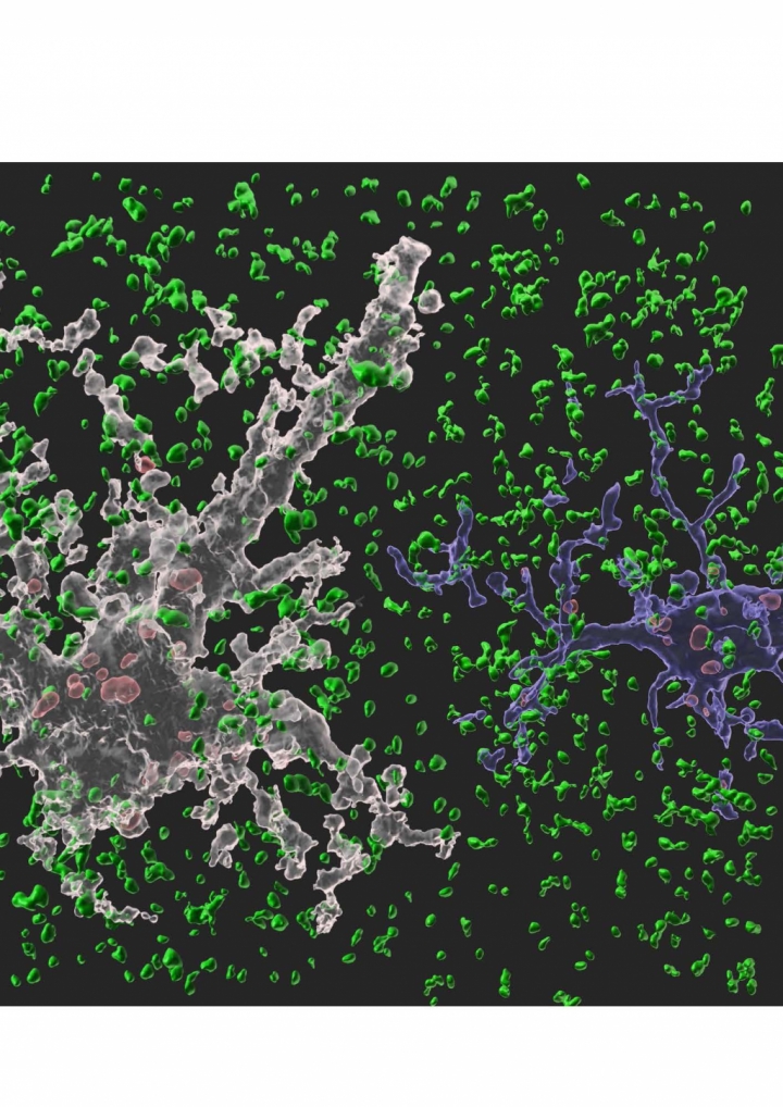 ▲ 뇌에서 뉴런을 도와 뇌 항상성 유지 역할을 수행하는 세포인 별아교세포(하얀색)와 미세아교세포(파란색)가 시냅스를 제거하고 있는 모습