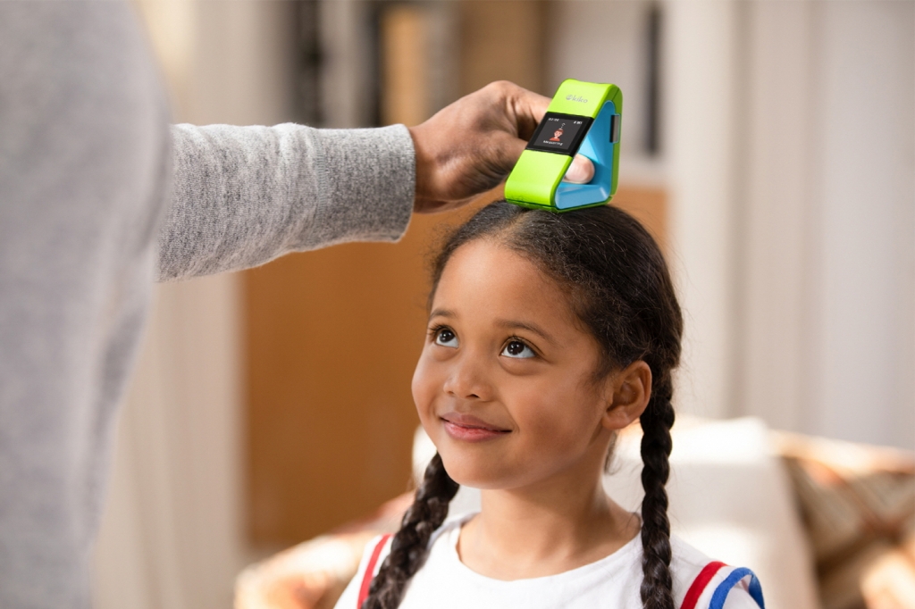 ▲ ‘맥파이테크’가 개발한 어린이 신체 발달과 성장 관리를 도와주는 디바이스로 어린이의 키를 재고 있다.
