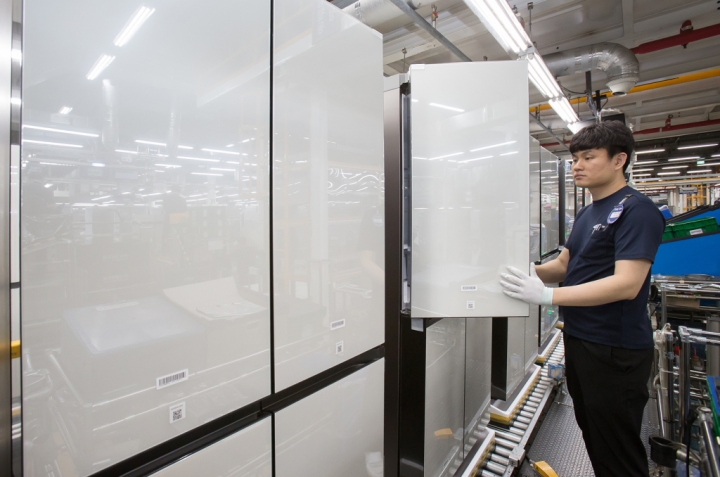 ▲ 광주광역시 광산구 하남산단 6번로에 위치한 삼성전자 광주사업장에서 직원들이 개개인의 라이프스타일에 따라 자유로운 조합이 가능한 모듈러 타입의 ‘비스포크 냉장고’를 생산하고 있다.