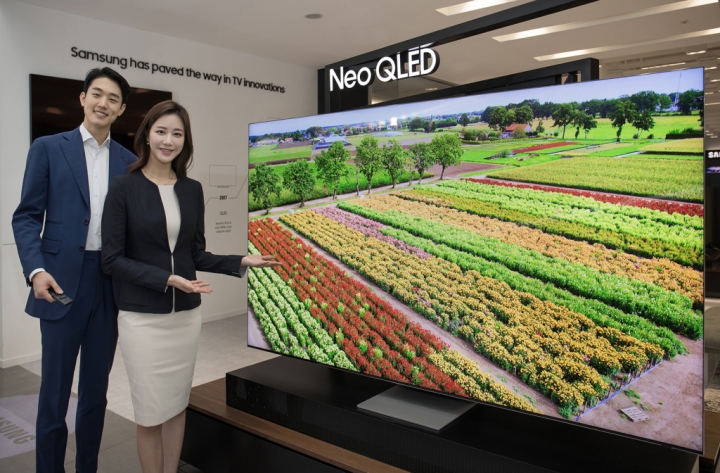 ▲ 삼성전자 모델이 수원 삼성 디지털시티에서 2021년 신제품 Neo QLED TV를 소개하고 있다.