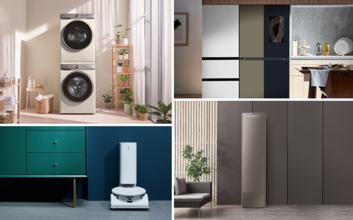 ▲ ‘그랑데 AI’ 세탁·건조기(상좌), ‘비스포크 패밀리허브’ 냉장고(상우), 로봇청소기 ‘제트봇 AI’(하좌), 무풍 에어컨 갤러리(하우) 라이프스타일 사진