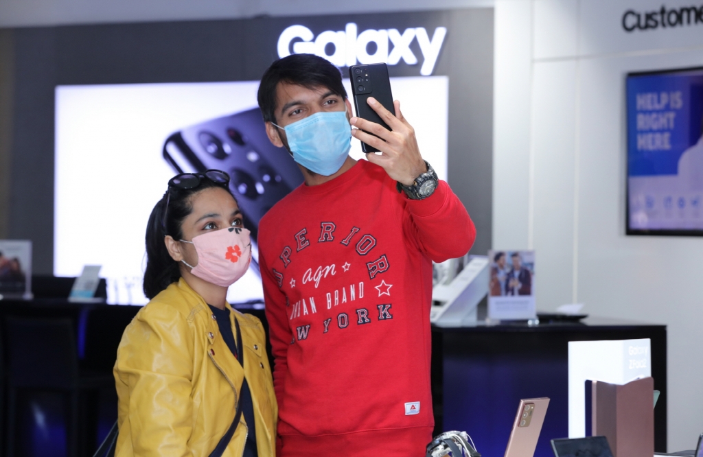 ▲ 인도 구루그람의 앰비언스 몰(Ambience Mall) 내에 위치한 삼성체험매장에서 현지 소비자들이 ‘갤럭시 S21’을 체험하고 있는 모습