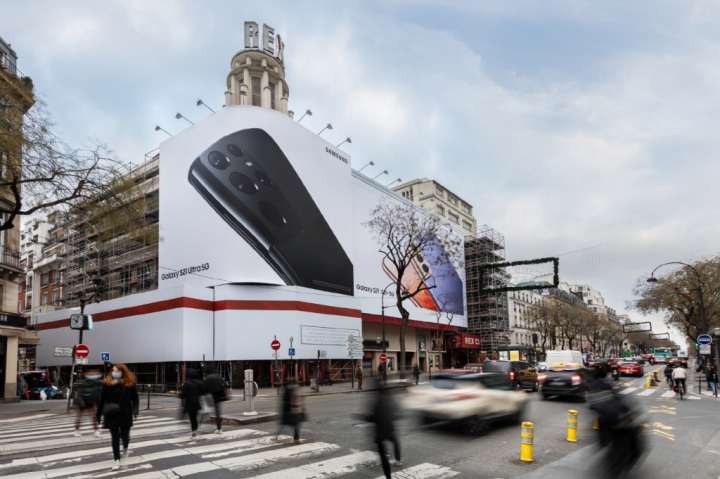 ▲ 프랑스 파리 르 그랑 렉스(Le Grand Rex) 극장에 설치된 ‘갤럭시 S21’ 옥외 광고 모습