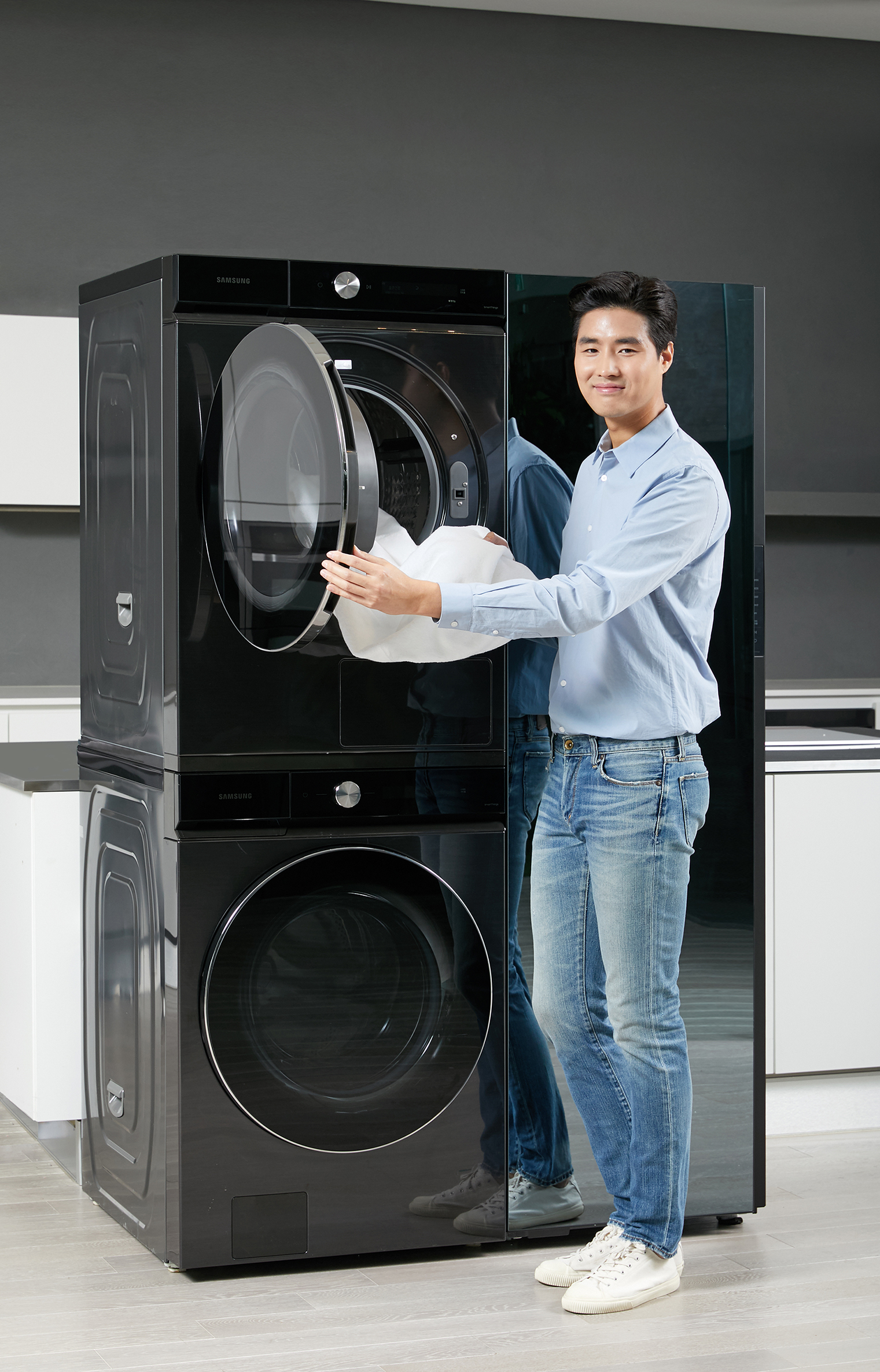 ▲ 삼성전자 모델이 수원 삼성디지털시티에서 ‘뉴 그랑데 AI’ 세탁기·건조기 신제품과 비스포크 에어드레서를 소개하고 있다.