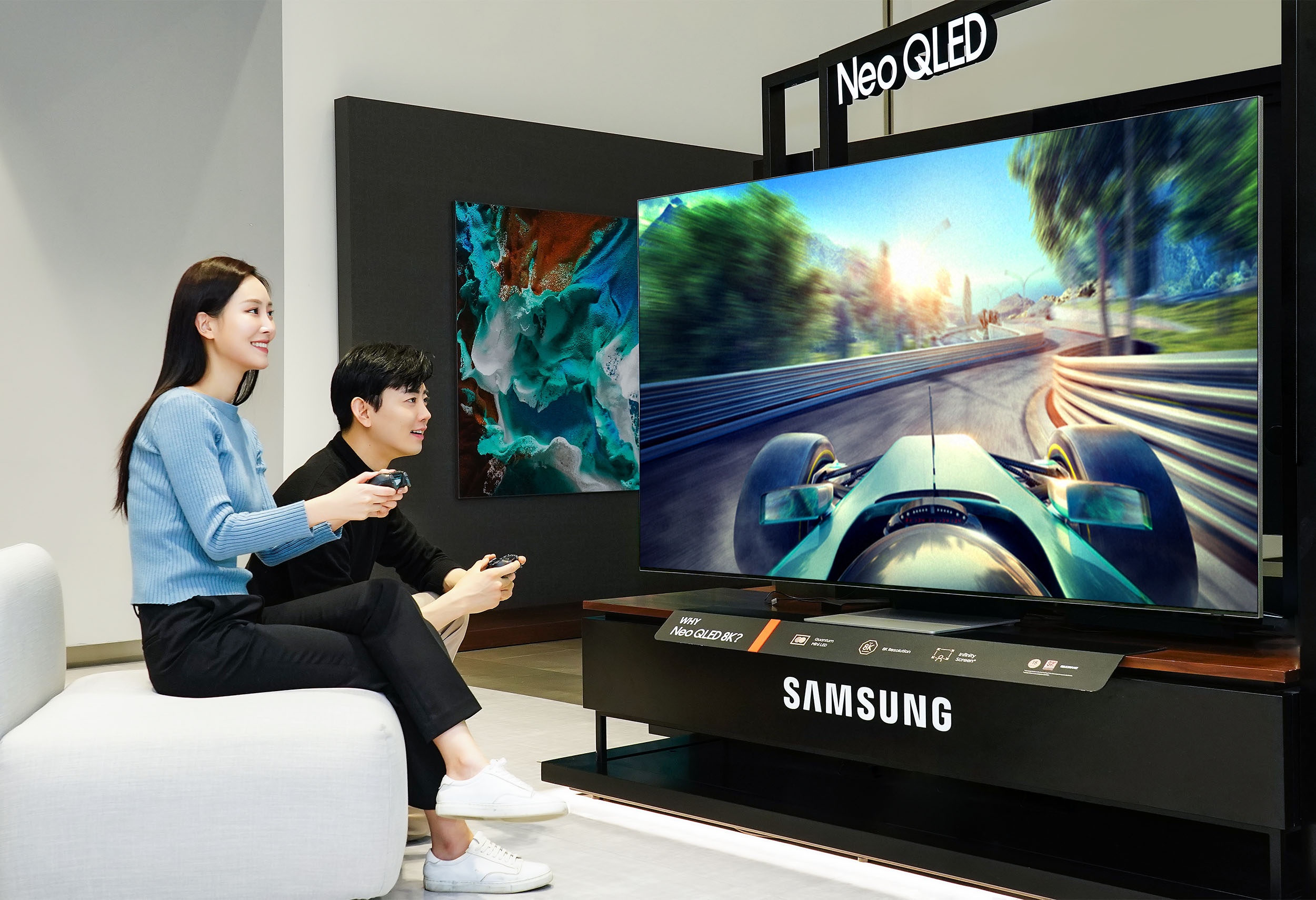 ▲ 삼성전자 모델이 삼성전자 수원사업장에서 Neo QLED TV의 게이밍 기능을 소개하고 있다.