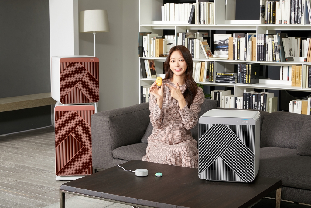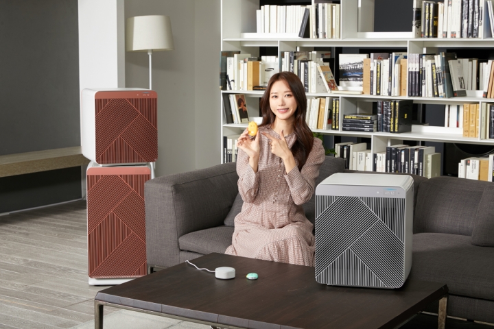 ▲ 삼성전자 모델이 수원 삼성전자 디지털시티 프리미엄하우스에서 삼성 공기청정기 ‘비스포크 큐브 에어’와 카카오엔터프라이즈 스마트 스피커 ‘미니헥사’, ‘미니링크’를 소개하고 있다.