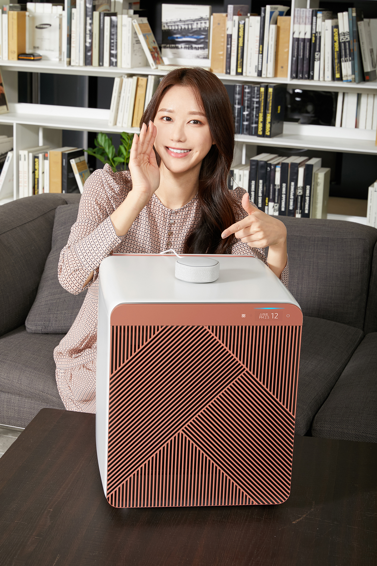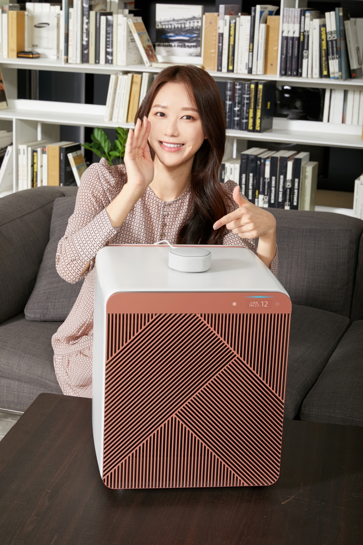 ▲ 삼성전자 모델이 수원 삼성전자 디지털시티 프리미엄하우스에서 삼성 공기청정기 ‘비스포크 큐브 에어’와 카카오엔터프라이즈 스마트 스피커 ‘미니헥사’, ‘미니링크’를 소개하고 있다.