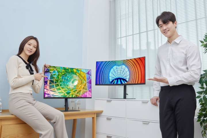 ▲ 삼성전자 모델이 서울 소재의 한 스튜디오에서 신제품 고해상도 모니터(왼쪽 S80A, 오른쪽 S65UA)를 소개하고 있다.