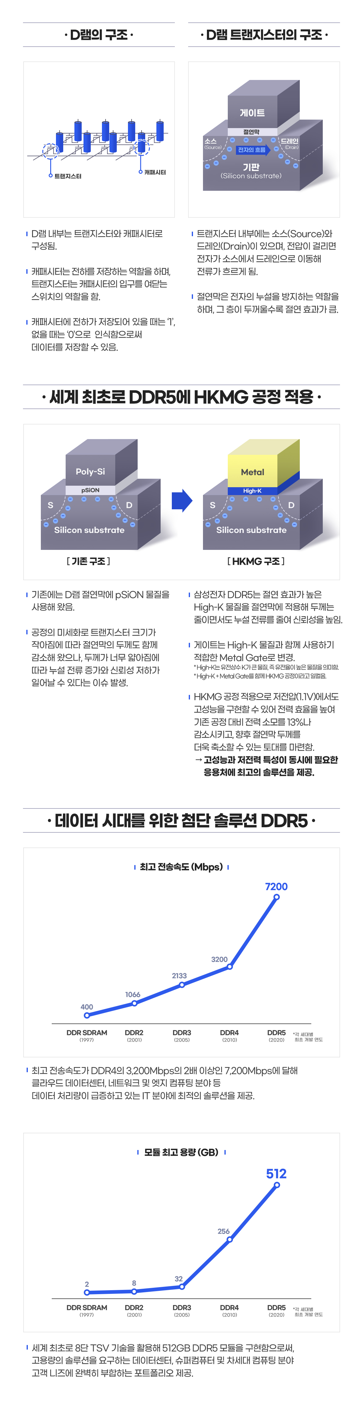 삼성전자가 업계 최초로 ‘하이케이 메탈 게이트 (High-K Metal Gate, 이하 HKMG)’ 공정을 적용한 업계 최대 용량의 512GB DDR5 메모리 모듈을 개발했다.