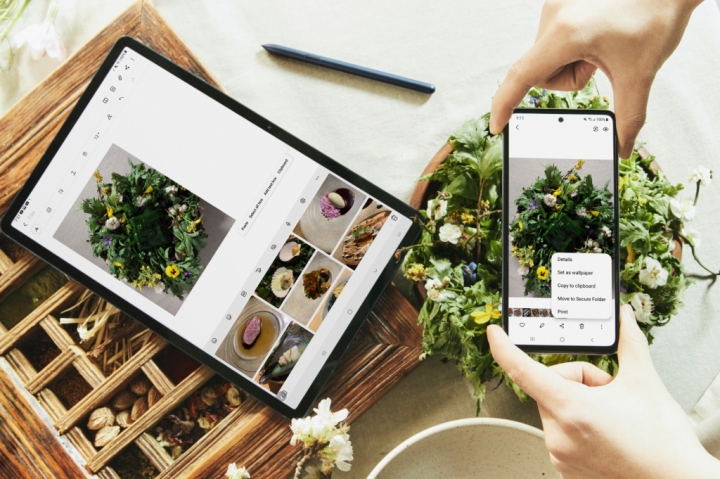 ▲ 삼성의 독자적인 사용자경험 원 UI 3.1이 적용된 삼성 ‘갤럭시 탭S7+’와 ‘갤럭시 A52’ 스마트폰을 연동해 사용하는 모습