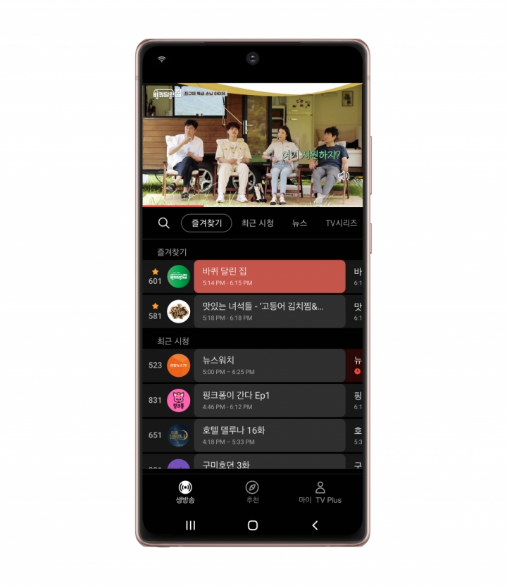▲ 삼성 TV 플러스 모바일 앱 내 ‘생방송’탭 실행 화면