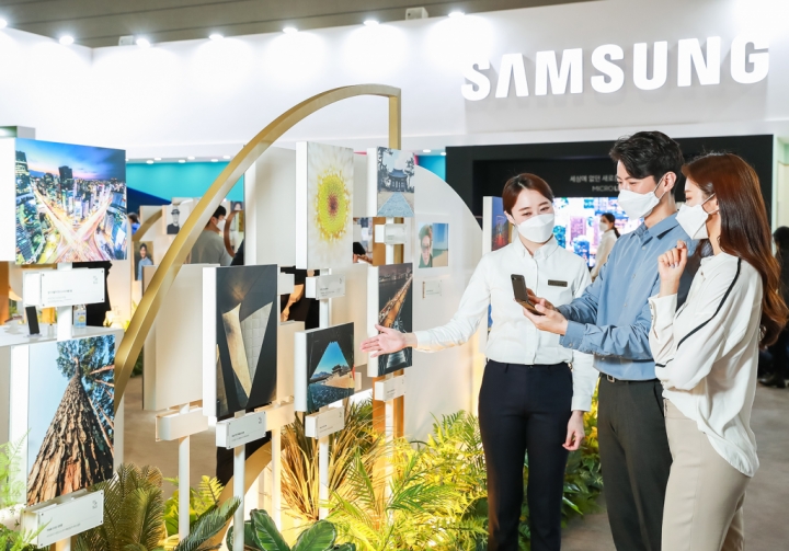 ▲ 서울 코엑스에서 열린 ‘월드IT쇼 2021’ 삼성전자관에서 관람객이 전문가급 성능의 갤럭시 S21 카메라로 촬영한 ‘갤럭시 모먼트 사진전’을 체험하고 있다.