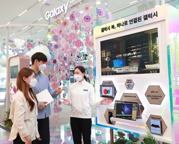 ▲ 삼성 디지털프라자 삼성대치본점 ‘갤럭시 스튜디오’에서 소비자들이 스마트폰·태블릿·웨어러블 기기 등 다양한 갤럭시 기기와 쉽고 편리하게 연동되는 ‘갤럭시 북 프로’ 시리즈의 혁신적인 연결성을 체험하고 있는 모습