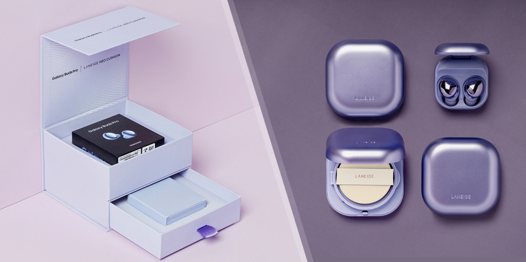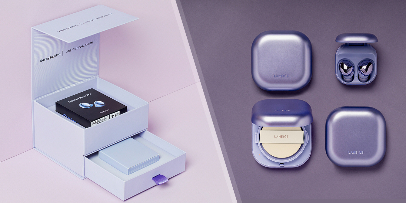 ‘갤럭시 버즈 프로 with 라네즈 네오 쿠션 콜라보라해’ 패키지는 팬텀 바이올렛 색상의 ‘갤럭시 버즈 프로’와 아모레퍼시픽의 뷰티 브랜드인 라네즈의 인기 쿠션 파운데이션 ‘라네즈 네오 쿠션’으로 구성됐다.