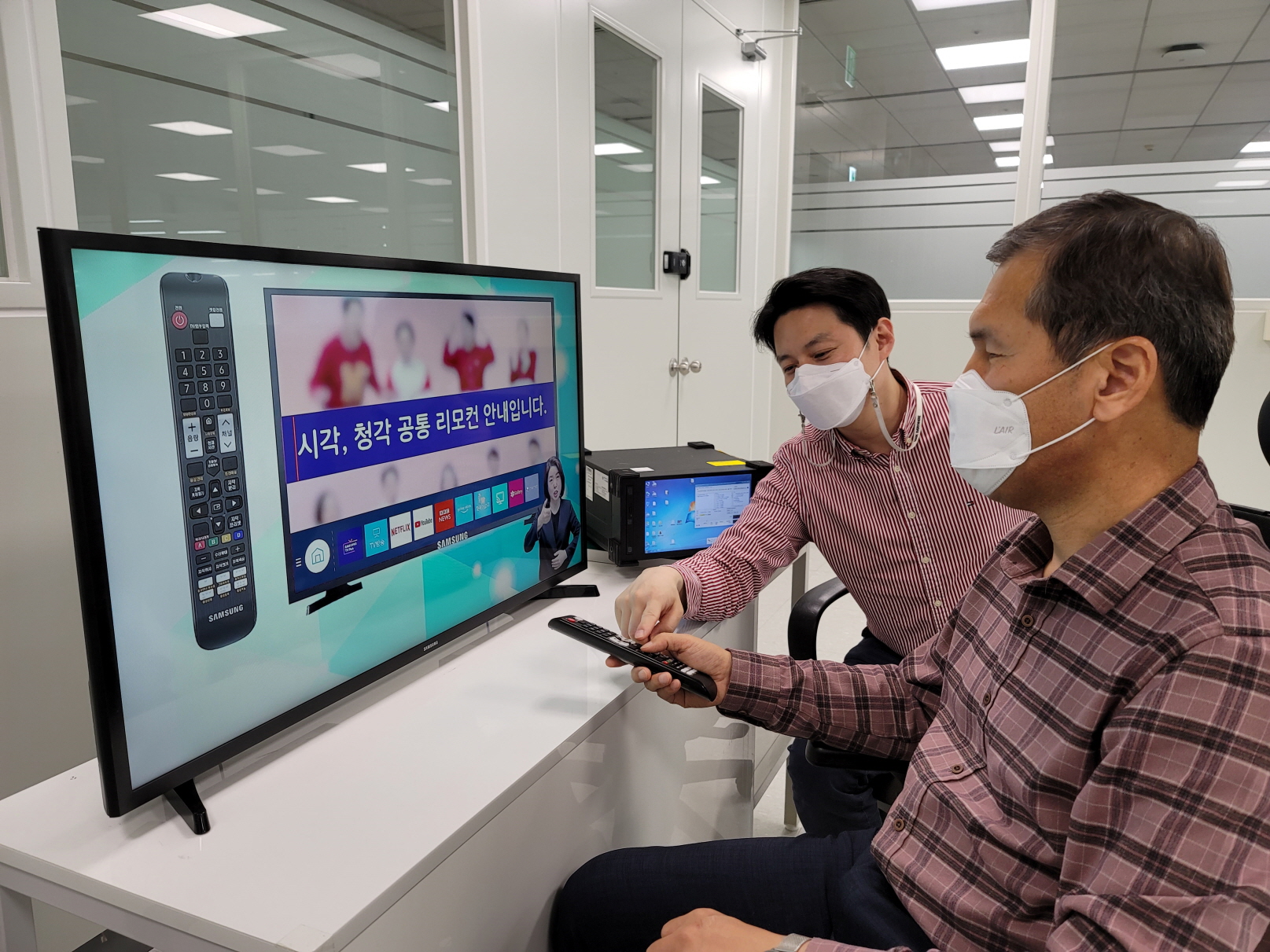 ▲ 삼성전자 수원 디지털시티에서 영상디스플레이사업부 담당 연구원과 시각장애 임직원이 올해 시청각 장애인용 TV 보급사업에 선정된 제품에 대해 의견을 나누는 모습