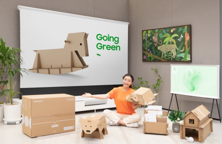 삼성 TV에 적용된 에코패키지는 포장 박스의 각 면에 인쇄된 도트(Dot) 패턴을 활용해 누구나 간편하게 자르고 조립하는 과정을 거쳐 다양한 생활 용품을 만들 수 있도록 디자인됐다.