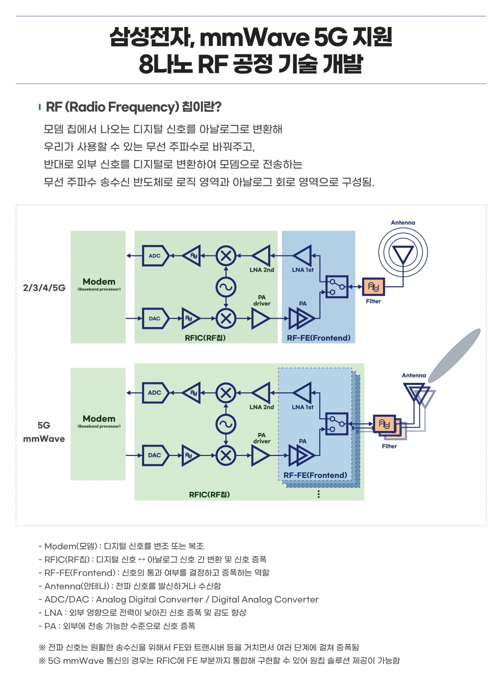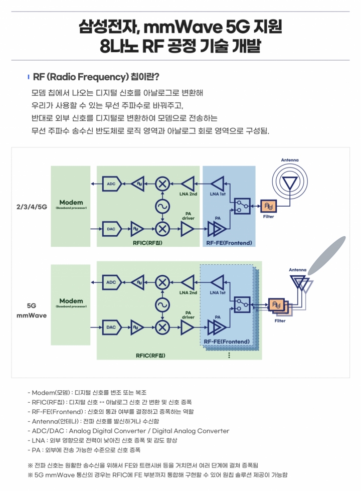 삼성전자는 8 나노 RF 파운드리로 멀티 채널, 멀티 안테나를 지원하는 5G 통신용 RF 칩을 원칩 솔루션으로 제공해 서브 6GHz부터 밀리미터파(mmWave)까지 5G 통신 반도체 시장을 적극 공략할 계획이다.