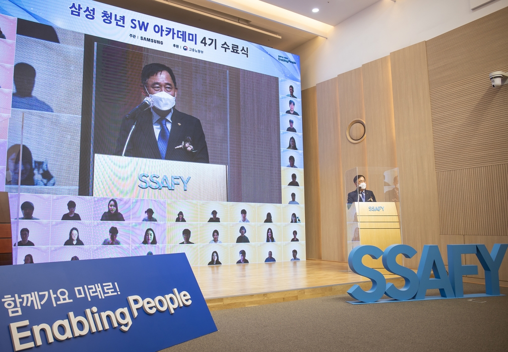 삼성전자는 9일 서울 강남구 멀티캠퍼스 교육센터에서 고용노동부 박화진 차관, 삼성전자 경영지원실 최윤호 사장이 참석한 가운데 ‘삼성청년SW 아카데미(Samsung Software Academy For Youth, SSAFY)’ 4기 수료식을 열었다.