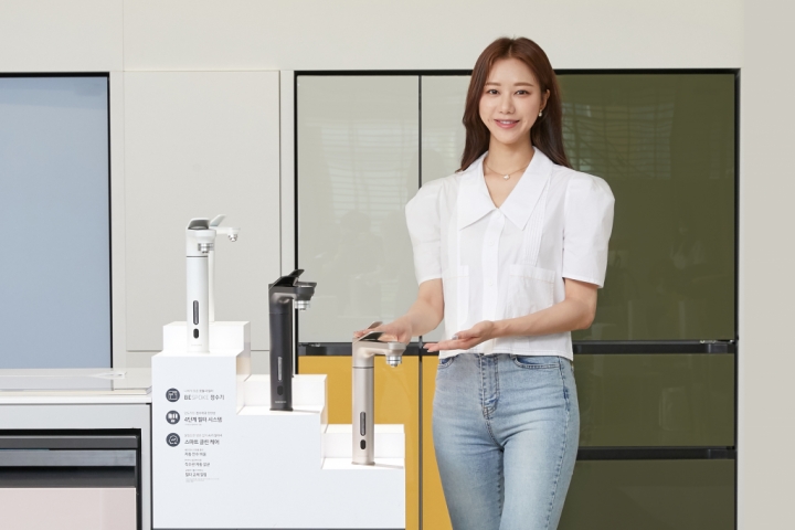 ▲ 삼성전자 모델이 서울 논현동에 위치한 삼성 디지털프라자 강남본점에서 출시 3개월만에 국내 판매 1만대를 달성한 ‘비스포크 정수기’를 소개하고 있다.