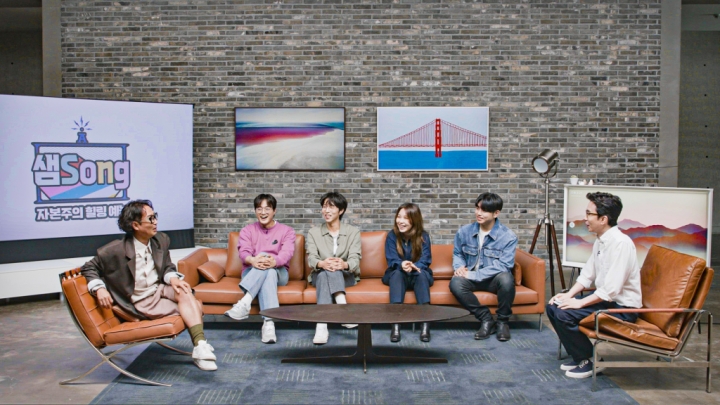 ▲ 엔터테인먼트사 안테나 소속 뮤지션들이 웹 예능 ‘샘Song’을 촬영하는 모습(사진1 기준 왼쪽부터 정재형, 페퍼톤스 이장원/신재평, 권진아, 샘김, 유희열)