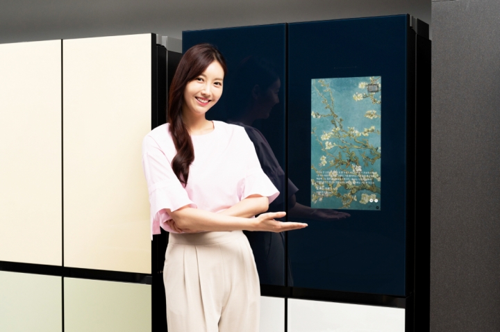 ▲ 삼성전자 모델이 삼성디지털프라자 강남본점에서 패밀리허브 냉장고 전용 애플리케이션 ‘비스포크 아뜰리에(BESPOKE Atelier)’를 통해 빈센트 반 고흐의 작품 ‘꽃 피는 아몬드 나무’를 소개하고 있다.